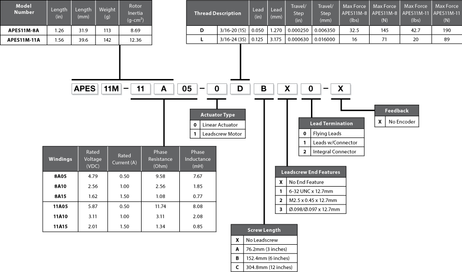 APES11M-11A15-0DB22-X | NEMA 11 Stepper-based linear actuator, 1.8 degree step angle, bi-polar windings, 15.6 oz-in holding torque, 1.5A/Phase, 3/16-20 ACME (1 Start), 0.05" lead | Buy Now |